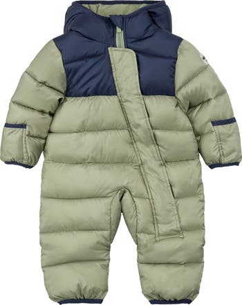 Baby will be ready for cold-weather adventures in this quilted bunting that's water repellent and lined in fleece. An attached hood and fold-over cuffs offer extra protection when out and about.