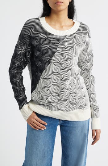 Two-tone yarns bring soft, rich texture to this easy-fitting sweater with a colorblock design that's tempered by its faded pallette.