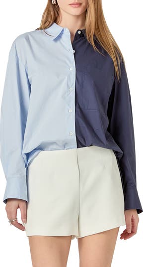 Dropped shoulders enhance the relaxed fit of this crisp poplin shirt designed with bold colorblocking and finished with a tuckable shirttail hem.
