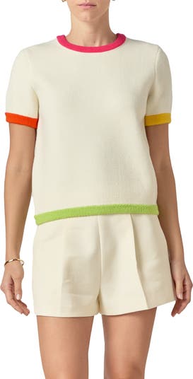Cheerful bands of color frame a short-sleeve sweater knit from soft, wool-kissed yarns with comfortable stretch.