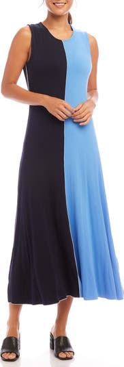 Contrasting blue-hued panels embolden this soft figure-skimming maxi made in a sleeveless silhouette and finished with a flowy skirt that sways with every step.