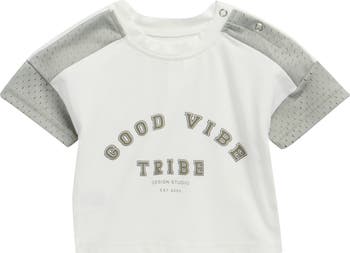 Make sure baby's vibes are immaculate in a stretch-cotton T-shirt made with mesh accents and shoulder snaps to make getting ready easy.