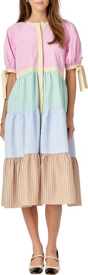 A carnival of colors comes to play across a tiered, striped shirtdress cut from cool poplin and framed by sweet puffed sleeves with ties at the cuffs.