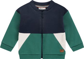 This cardigan sweatshirt features a multitoned Colorblock pattern and zip enclosure.