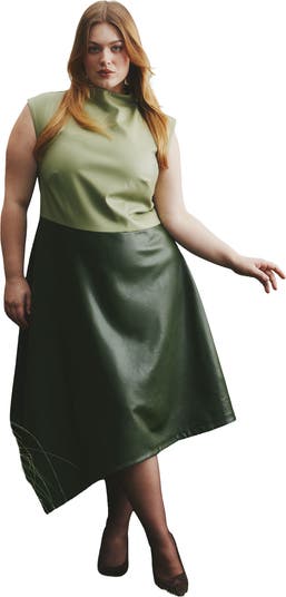 - Command attention in this colorblocked faux leather midi dress with a draped finish. An asymmetrical hem and sleek bodice bring a modern edge to your elevated rotation.