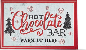 - Dust with a dry cloth to maintain the vibrant colors of the Hot Chocolate Bar Sign. This product is for indoor use only and measures 9 inches in height, 14 inches in length, and 1 inch in width. Incorporate it into your holiday displays alongside wood boards and festive serving trays to showcase delicious hot chocolate toppings. The fun design on durable fir wood makes it versatile for hanging or tabletop use.