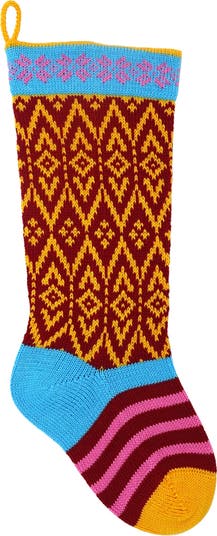 Brighten up your holiday season with this bold and eclectic Knit Holiday Stocking. Featuring a rich red base with intricate yellow diamond patterns, this stocking brings a warm and vibrant flair to your holiday décor. The striking blue cuff is adorned with a delicate pink floral design, adding a touch of whimsy and contrast. The heel and toe showcase a playful mix of bright blue, pink, and orange stripes, creating a dynamic and joyful aesthetic that’s sure to stand out. Perfect for hanging by the fireplace, this stocking is as functional as it is decorative, offering plenty of room for treats, small gifts, and holiday surprises. The durable cotton weave ensures that this stocking will become a cherished part of your holiday traditions for years to come.