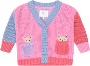 Meet the 'wear everywhere' cardi. This lightweight knit cardi is made from premium organic cotton in a deliciously soft jacquard knit. Featuring front pockets with cute peekaboo Huxette and fun colour blocking.