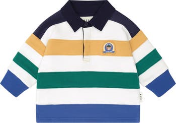 This classic rugby fleece jersey features a sporty collar and three buttons at the neck. Made from cloud-like organic cotton, it features colour blocked panels and a peekaboo varsity Huxbear detail.
