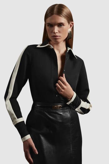 Collared long-sleeve shirt with sculpted silhouette, fluid drape and sharp cuff detail, designed for a confident work-to-evening wardrobe.