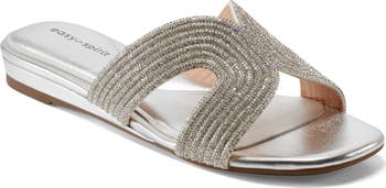 Geometric side cutouts and a jewel-encrusted upper add visual intrigue and a dose of glam to a slide sandal set on a cushioned footbed with superior arch support.