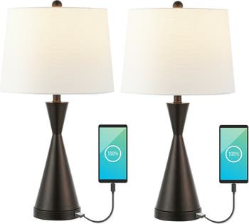 - Includes a linen-look hardback empirical shade and USB charging port for mobile devices