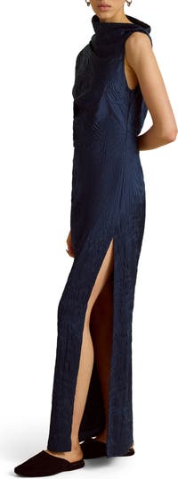 The Jacquard Column Dress uses the wearer's body to create it's asymmetrically draped bodice. Rendered in a lightweight navy blue jacquard, the modern column-silhouette is punctuated by the soft neckline.