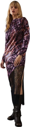 Embrace elegance with this Column Lace Panel Midi Dress, featuring an artistic print that exudes sophistication and charm. Perfect for making a stylish statement.
