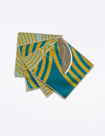 The Comb cocktail napkins undulate and swish in jewel tones of emerald, garnet, and peridot. Each napkin is finished with a purl stitched accent edge. Our double-sided table linens have a distinct design on the front and back where the pattern shifts in scale and the colors vibrate in surprising combinations on each side. The cocktail napkins are printed on 100% cotton shantung with a light woven texture and a luxurious touch. Cocktail napkins are sold as a set of 4. Dimensions: 5" L x 5" W.