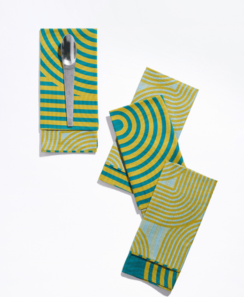 We call this pattern the Comb to describe its mesmerizing undulations. In rich, jewel-toned emerald with accents of garnet and peridot, this sophisticated design adds visual flair to the tabletop. Our double-sided table linens have a distinct design on the front and back where the pattern shifts in scale and the colors vibrate in surprising combinations on each side. The dinner napkins are printed on 100% cotton shantung with a light woven texture and a luxurious touch. Dinner napkins are sold as a set of 4. Dimensions: 18.9" L x 18.9" W.