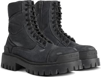 A bulbous toe and superchunky lug sole amplify the no-nonsense attitude of this lace-up combat boot crafted from faded canvas for a battle-worn look.