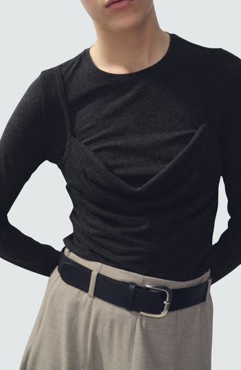 A draped camisole adds texture and dimension to this soft stretch-kissed top.