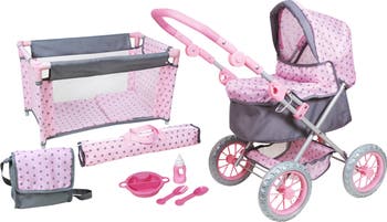 Combo Baby Doll Play Set, Pink & Grey Polka Dot, Bed, Pram, Fits Up to 18 Inches