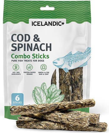 ICELANDIC+ COMBO STICKS - COD & SPINACH - 2OZ BAG - The Icelandic+ Cod & Spinach Combo Sticks for Dogs contain just two ingredients - responsibly sourced cod and spinach - slow baked to perfection. These crunchy sticks boast an irresistible taste and are packed with omega-3 fatty acids and protein. Combo sticks are a healthy reward perfect for a pup with protein sensitivities. Key Features & Benefits: - Six Sticks Per Bag - Crunchy Treat - All Natural - Packed with Protein - Omega 3's for Skin & Coat - Just Two Ingredients - Always Responsibly Sourced - Slow Baked - Wild Caught Fish - No Preservatives. NUTRITIONAL INFORMATION: Ingredients: Cod and Spinach. Guaranteed Analysis: Crude Protein 60% (max), Crude Fat 4% (min), Crude Fiber 1% (min), Omega-3 Fatty Acids 1% (min), Moisture 12% (max). Feed the Icelandic+ Cod & Spinach Combo Sticks for Dogs as a treat and always ensure that your dog has access to clean, fresh water.