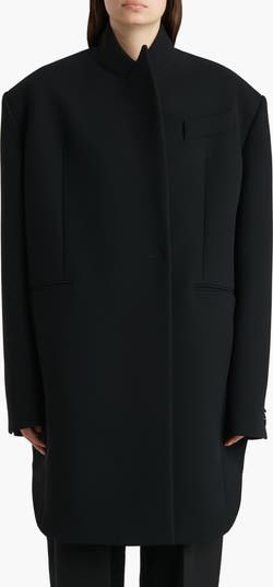 This boldly shouldered double-face crepe coat takes its cues from menswear but with a twist—the richly textured piece has a high, sculpted back and deliberately flattened peaked lapels.