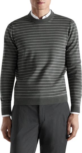 Thinly striped jersey makes this crewneck sweater with ribbed trim the perfect layering piece.