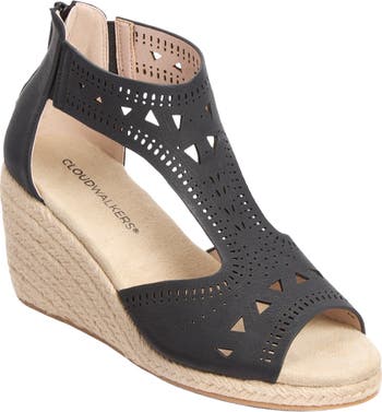 - Meet our favorite sandal for sunny days. The sophisticated leather-like upper elevates all your go-to outfits for a pair you&rsquoll never want to take off. Leather-like upper with elastic goreFaux-leather heel counter with back zipJute wrapped 3" wedge heel Espadrilles available in full sizes 7-13 W