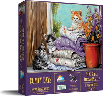 Experience a serene retreat with the Comfy Days 500 piece jigsaw puzzle, featuring the exquisite art of John Stewart, inviting you into a charming tableau of cozy kittens and delicate flowers that embodies nature's warmth and tranquility. Designed for a hassle-free puzzle experience, the interlocking pieces fit seamlessly, enhancing enjoyment while minimizing frustration. SunsOut emphasizes durability and quality in their construction, using high-quality recycled cardboard that ensures longevity. Environmentally conscious, these puzzles are crafted from eco-friendly materials, employing soy-based inks and recycled board, allowing you to indulge in creative relaxation without compromising your values. Proudly made in the USA, each puzzle reflects meticulous craftsmanship and high manufacturing standards, further supported by a worry-free guarantee. This 500 piece puzzle serves as a perfect gift for puzzle enthusiasts or a personal hobby, and upon completion, it measures 18" x 24", making it an ideal candidate for framing and display. The delightful imagery by John Stewart turns each puzzling session into a vibrant journey of charm and discovery, encouraging you to reconnect with creativity and calm through SunsOut puzzles.