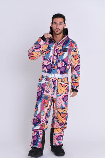 Model information - Height 5'11" | 38" Chest, 32" Waist | Wearing size Medium At a Glance Features: Are you bored of plain black, navy and grey ski suits? US TOO.... You need fun and colour on the mountains! We are empowering you to rip up the slopes with panache & style, whilst dropping jaws & turning heads as you strut into Après like a boss as the beat drops. On top of this all of our outerwear is made from recycled polyester meaning you can look amazing and do your bit for the planet at the same time! The OOSC Men's ski suit is the only piece of ski clothing you'll ever need, from dropping cliffs to dropping jagerbombs at Après, this one piece will keep you warm and dry all season long! The OOSC mens / unisex suit is a relaxed Freeride fit. Other Features: Water Proof Exposed Zippers Lift Pass Pocket Fleece Chin Guard Goggle Pocket Cuff Gaiters With Thumbholes Reinforced Durable Ankle Patches Helmet Adaptable Hood Elasticated Ankle Gaitors Velcro Adjustable Wrist Straps Elasticated Waist & Adjustable Belt Mesh Lined Vents Shaped Elbows & Knees Full list of our technical features. OOSC are extremely proud to have be able to say that ALL of our outerwear is made from Recycled Polyester and each suit is made from at least 50 plastic bottles!! (Read about how our suits are made from plastic bottles)