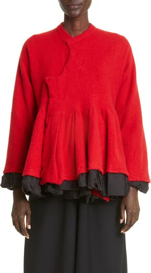 For the label's fall 2022 runway show, voluminous silhouettes predominated, such as this peplum jacket crafted of wool-blend serge with a contrast underlay.