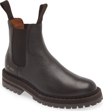 A durable lug sole grounds this refined Chelsea boot impeccably crafted from grained leather with double pull-tabs and signature foil stamping at the heel.