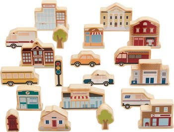 2 years & up. This beautiful wooden Community Block Set contains everything children would need to create their very own block town. Incorporate recognizable buildings like a school, hospital, and bakery as well as vehicles, trees, a fire hydrant, and a stop light to enhance dramatic play possibilities and storytelling during traditional block play activities. Colorful, detailed images are heat transferred onto both sides of the thick blocks included in this 20-piece set.