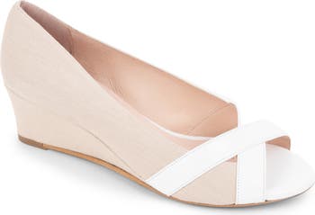 Crisscrossing leather straps accentuate the peep-toe design of this perfectly polished wedge sandal.