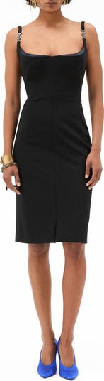 The built-in satin bustier doubles as tonal trim at the neckline of this classic LBD reminiscent of '60s Italian cinema with Versace iconography cast in the hardware.