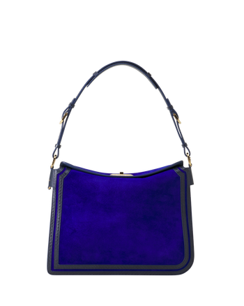 The Compagnon bag has been a Lanvin classic since Winter 2025. It captivates with the subtle elegance of its fine materials and its enveloping style. The asymmetrical design is structured and highlighted by graphic topstitching that forms the initials J and L, a subtle tribute to Jeanne Lanvin. Designed to combine functionality and refinement, this model offers organized storage thanks to three interior gusseted pockets. It is crafted from supple suede and enhanced with genuine python leather details. For this collection, it embodies the Lanvin blue, the House's signature color since the 1920s.
