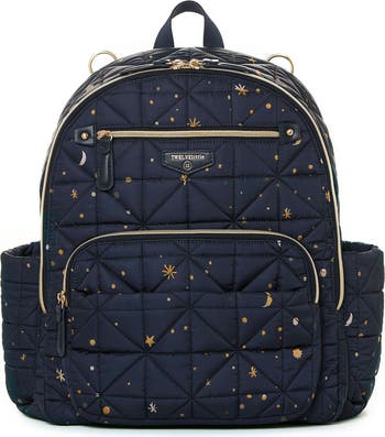 A go-anywhere diaper backpack is made from durable, water-resistant quilted fabric and detailed with an array of pockets to help keep you organized on the go.