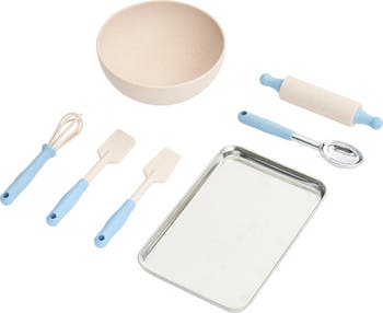 - Set includes a mixing bowl, a baking tray, a large spoon, rolling pin, whisk, and two spatulas