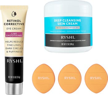 - What’s Inside: 1. Retinol Corrective Eye Cream (0.5 oz / 14 g) Say goodbye to tired-looking eyes with this lightweight, dermatologist-inspired formula. Retinol helps smooth fine lines, brighten dark circles, and reduce puffiness while keeping the delicate under-eye area hydrated and refreshed. Perfect for daily use—morning and night. 2. Finger Beauty Blenders (3-Pack) Achieve professional-level makeup application with compact, fingertip blenders. Designed for precision, they fit perfectly on your finger to blend foundation, concealer, or highlighter seamlessly—even in hard-to-reach areas. Small, convenient, and perfect for travel or on-the-go touch-ups. 3. Deep Cleansing Skin Cream with Eucalyptus Oil (12 oz / 340 g) Refresh and restore your skin with a tingling, cooling cleanse. Infused with natural eucalyptus oil, this dermatologist-tested cream removes dirt, oil, and impurities while leaving skin soft, smooth, and invigorated. Gentle enough for everyday use, it delivers a spa-like clean you’ll love.