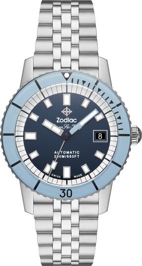 Pops of color modernize a stainless steel bracelet watch outfitted with powerful water resistance and luminescent details.