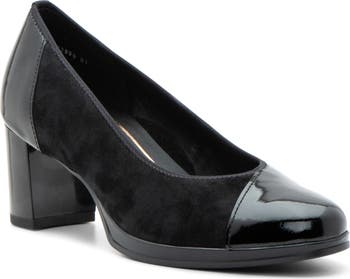 Sleek patent leather carves an asymmetric path across this streamlined pump furnished with an elastic topline and a chunky half-column heel. Cushy padding and a highly flexible sole combine for all-day walkable comfort that doesn't sacrifice style.