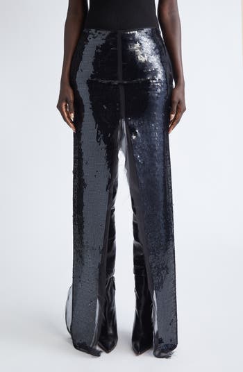 Featured on the brand's fall '25 runway, this floor-pooling straight skirt with soaring front and back slits is spliced together from panels of silk chiffon embroidered with sequins. Raw edges and raised seam details complete the look.