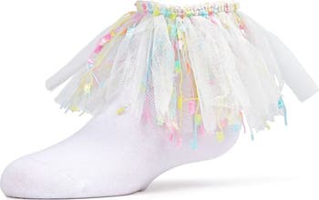 Every day's a celebration with MeMoi's Girls Confetti Ankle Socks! These sweet white socks have match tulle-inspired fabric all around the ankle, showering feet with multi-colored confetti-inspired stripes. Match 'em with Mary Janes, flats, or even sneakers!