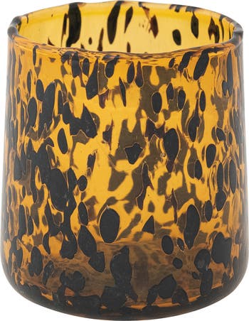 - A stylish drinking glass with a rounded silhouette and a unique confetti pattern in a sophisticated tortoise shell finish