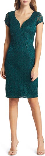Turn up the heat in this showstopping cocktail dress covered in lace and sequins and rendered in a siren shade.