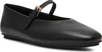 A slender strap secures a sleek mary jane flat with a softly rounded toe.