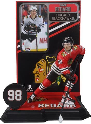Connor Bedard (Chicago Blackhawks) NHL 7" Figure McFarlane's SportsPicks. Connor Bedard (Chicago Blackhawks) 7” Figure. Connor Bedard’s first two debut NHL games were the most-watched regular season ice hockey games for ESPN and TNT respectively. He became the third-youngest player in NHL history to record a four-point game and the youngest in Blackhawks franchise history to record a multi-goal game. Bedard finished the 2023-24 season with 22 goals and 61 points in 68 games and received the Calder Memorial Trophy as rookie of the year. Bedard was selected to represent the Blackhawks at the 2024 National Hockey League All-Star Game and would have been the youngest All-Star in NHL history. However, due to a broken jaw he was placed on injured reserve and was excluded from the All-Star Game rosters.