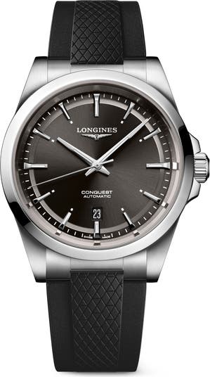 From the long-lived, long-loved Conquest collection comes this quintessential everyday watch featuring a sleek, simple design and set on a dual-texture rubber strap with a cleverly designed deployant closure that mimics a buckle in both appearance and adjustability.