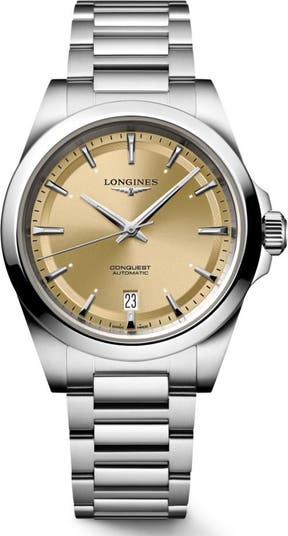 Since 1954, the Conquest line has been keeping time with precision, polish and sporty panache. This latest evolution of the legendary timepiece keeps the look simple and elegant with a minimalist champagne-hued dial.