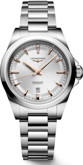 Since 1954, the Conquest line has been keeping time with precision, polish and sporty panache. This latest evolution of the legendary timepiece keeps the look simple and elegant with a minimalist silvertone dial.
