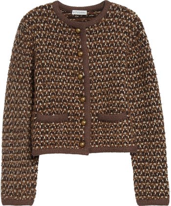 Give your cold-weather look a grandma-chic upgrade in this vintage-inspired jacket crafted in a tawny tweed woven with wool and alpaca for cozy warmth. Golden buttons and chunky, plaited trim add to the sophisticated dimension of the piece.